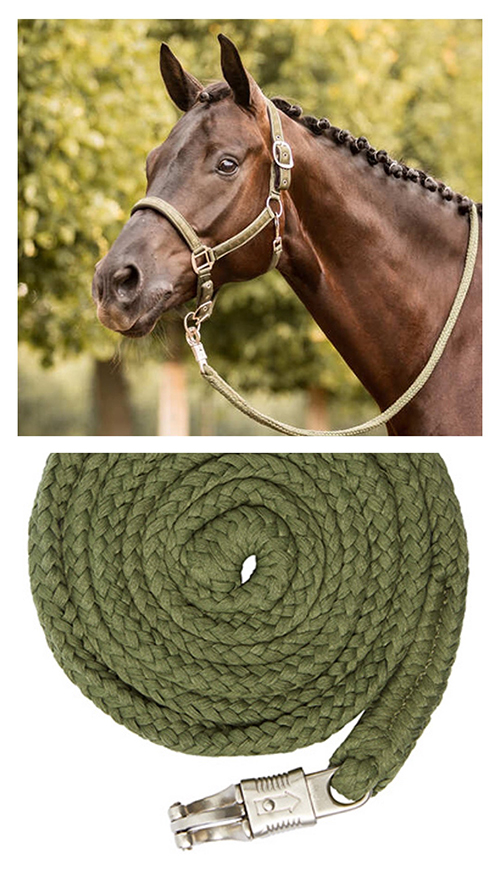 Imagen 1 y 2. Cabezada de cuadra y ramal con mosquetón de seguridad. Fuente: www.horze.es (2/11/2023) Ramal con mosquetón anti-pánico Horze Victoria.