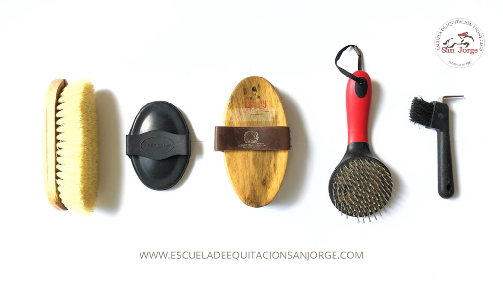Imagen 1. En la que se pueden ver los distintos cepillos (de izquierda a derecha): cepillo de raíces, rasqueta de goma, bruza, cepillo para crines y cola y limpiacascos.